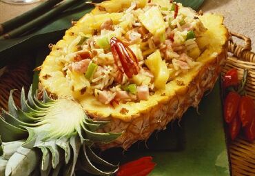 泰式菠萝炒饭,运用泰国香米的香气,搭配菠萝以及什锦蔬菜等大火快炒,咸咸酸酸甜甜的口感,才吃一口就会让人食欲大开,撘配腰果一起入口,口感层次丰富,相当值得推荐!尤其把饭装在菠萝里一起上桌,视觉效果奇佳!